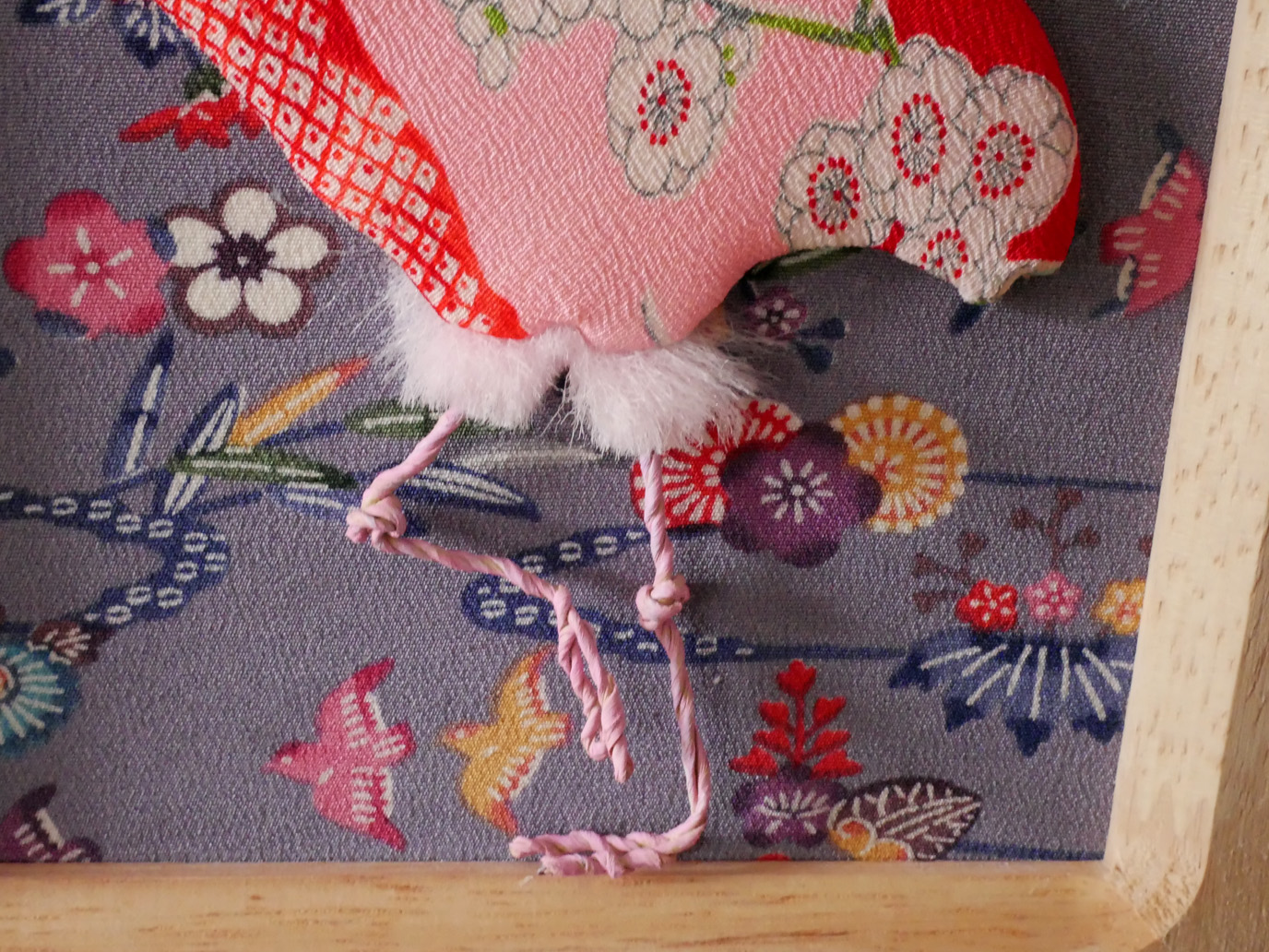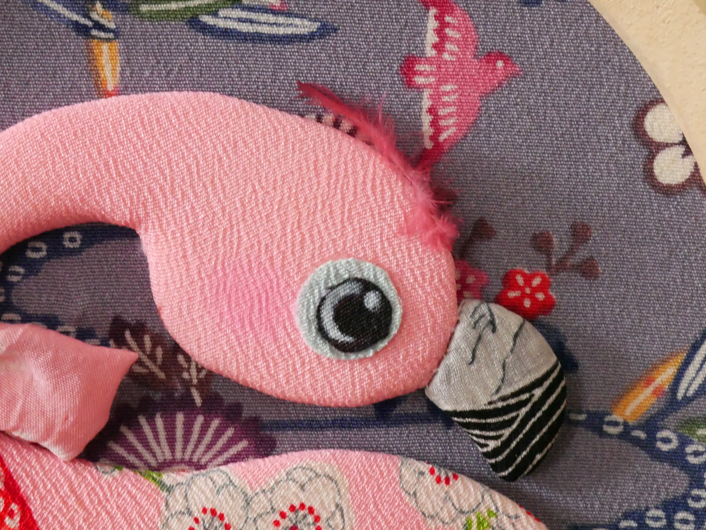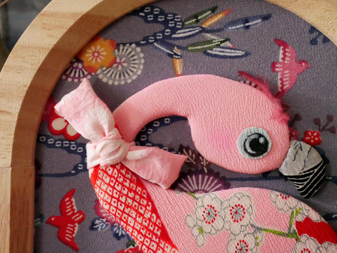 En soies de kimono japonais vintage, réutilisées pour donner naissance à ce joli flamant benizuru べにづる(flamant rose). Des coloris rouge coccinelle, pétale de rose, rose bonbon, lin et cerise aux motifs de fleurs traditionnelles stylisées que l’on trouve sur les kimonos des enfants.