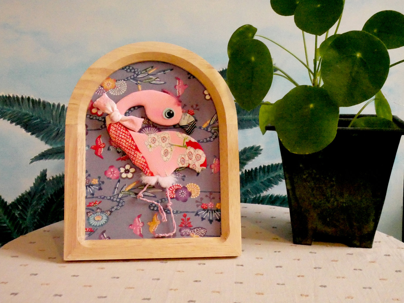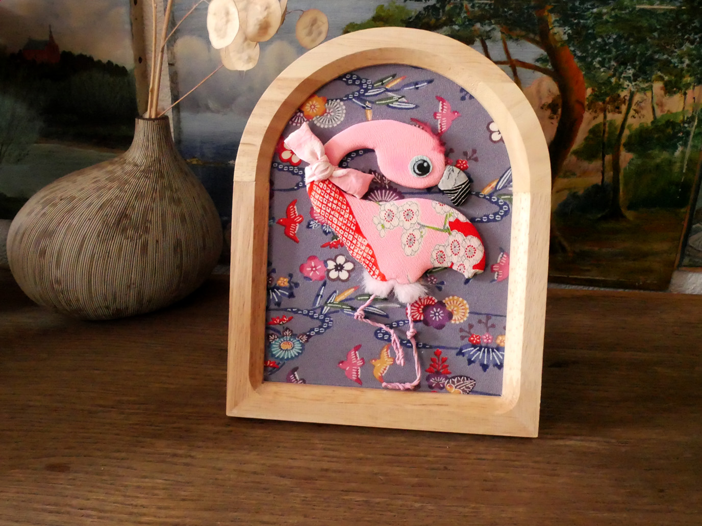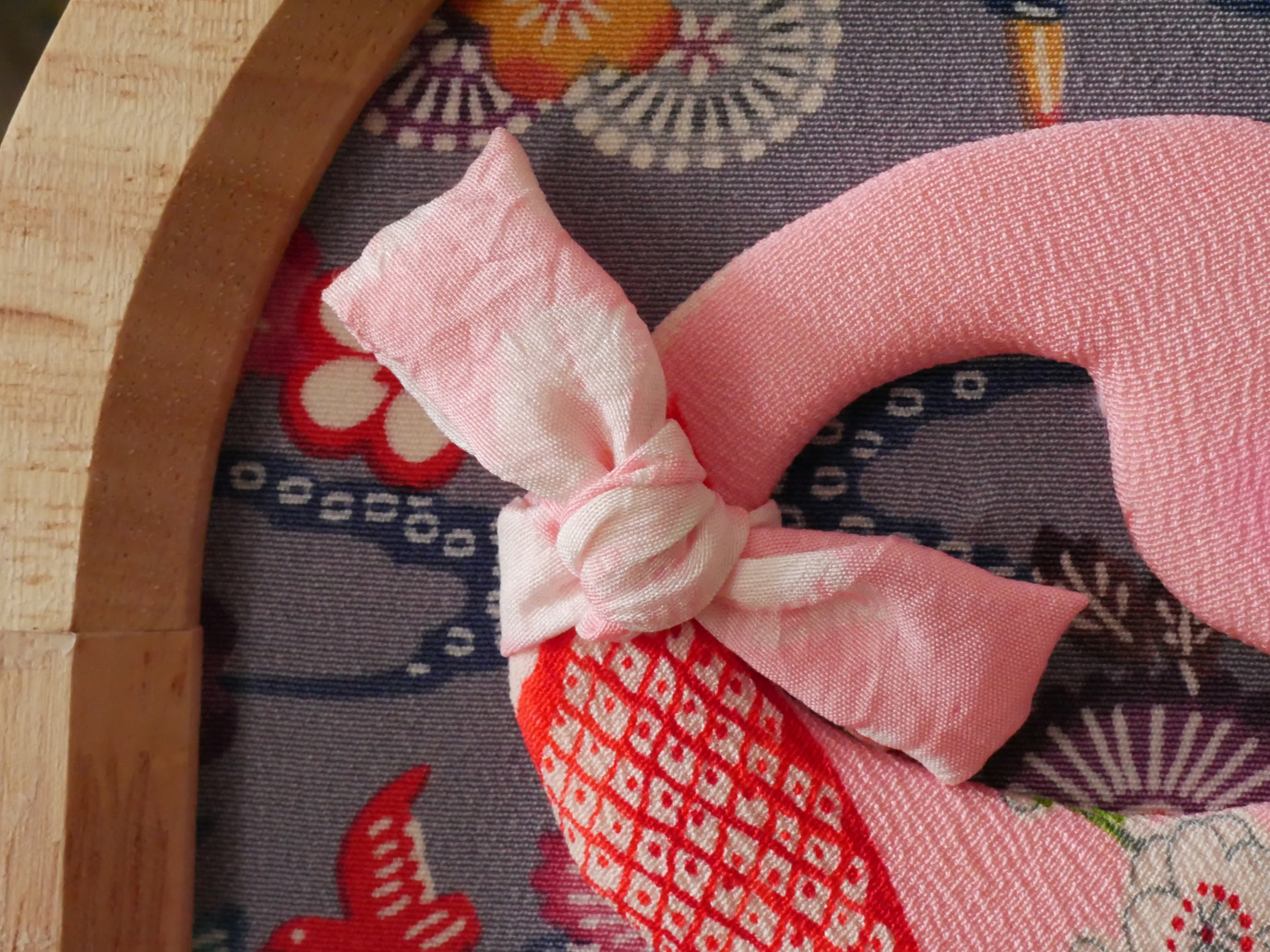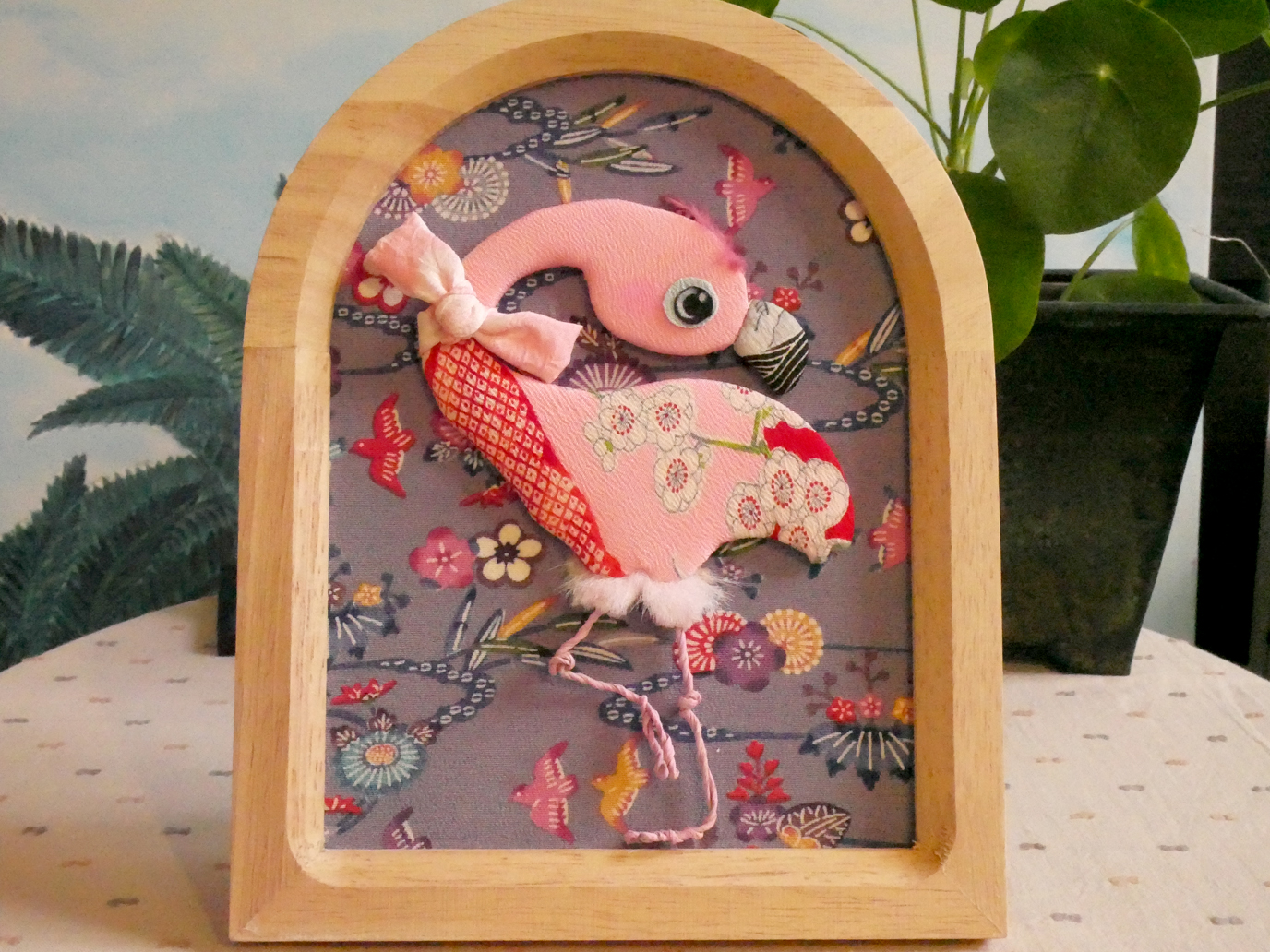 En soies de kimono japonais vintage, réutilisées pour donner naissance à ce joli flamant benizuru べにづる(flamant rose). Des coloris rouge coccinelle, pétale de rose, rose bonbon, lin et cerise aux motifs de fleurs traditionnelles stylisées que l’on trouve sur les kimonos des enfants.